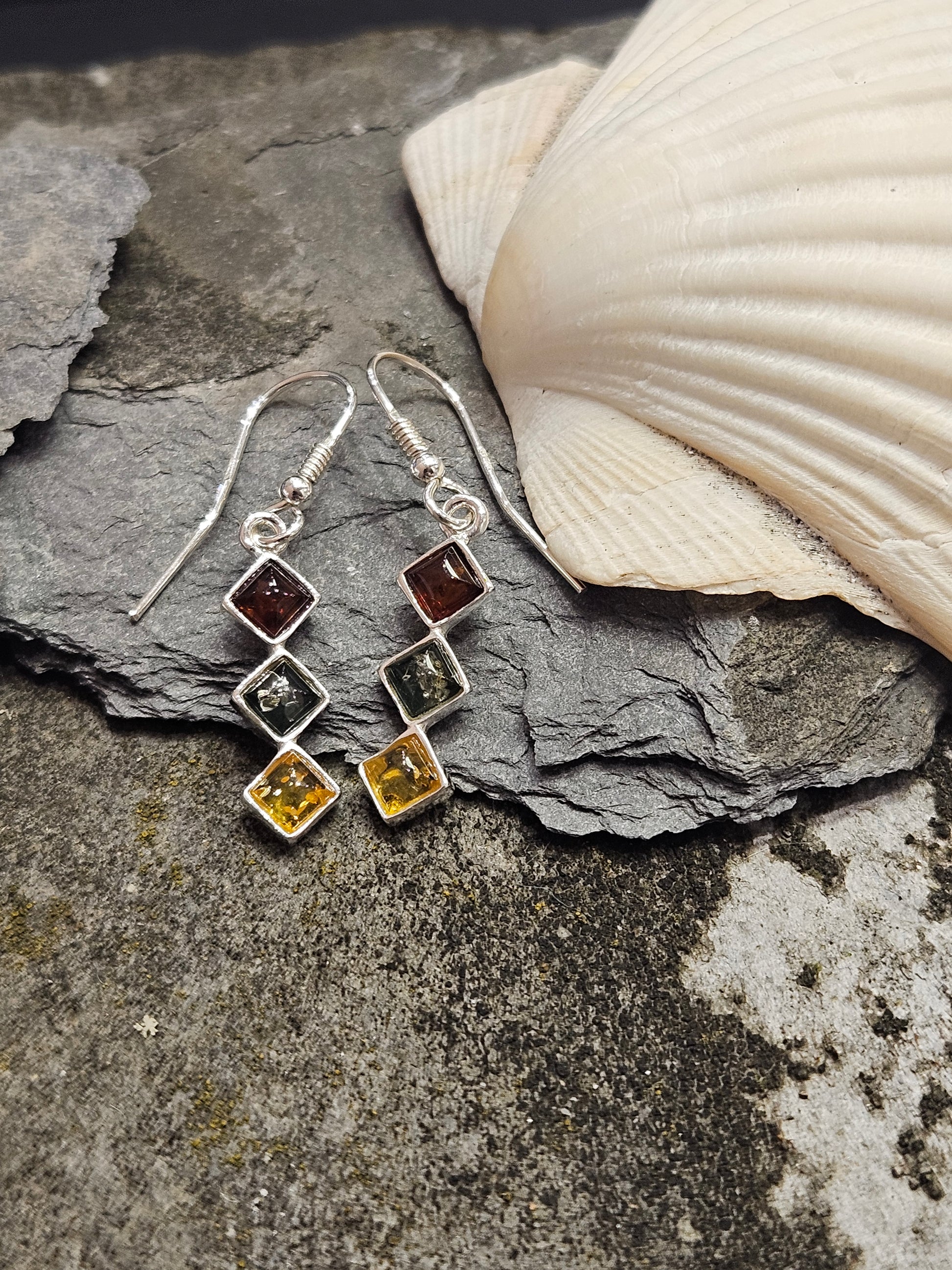 Green and lemon amber are used alongside classic cognac amber to great effect. These earrings measure width 7mm, Height 38mm including hook, Depth 4mm. All measurement are approximate and measured at widest/longest point.