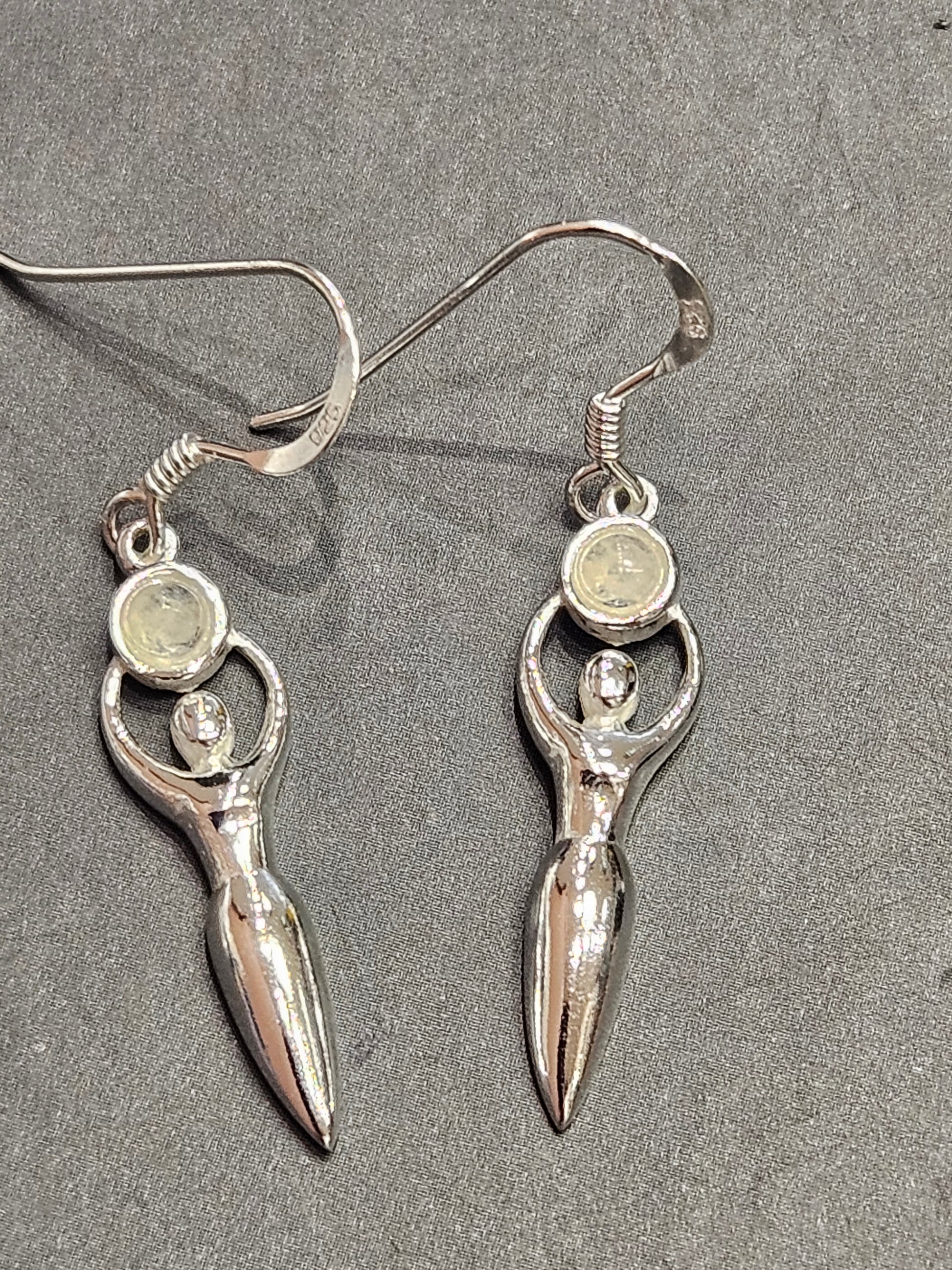 The Goddess has her arms up holding a Full Moon, the centre of the moon has a Rainbow Moonstone set within it. These Beautiful Earrings are 3 3/4cm long including hooks & the Moonstone cabochon is 4mm round.