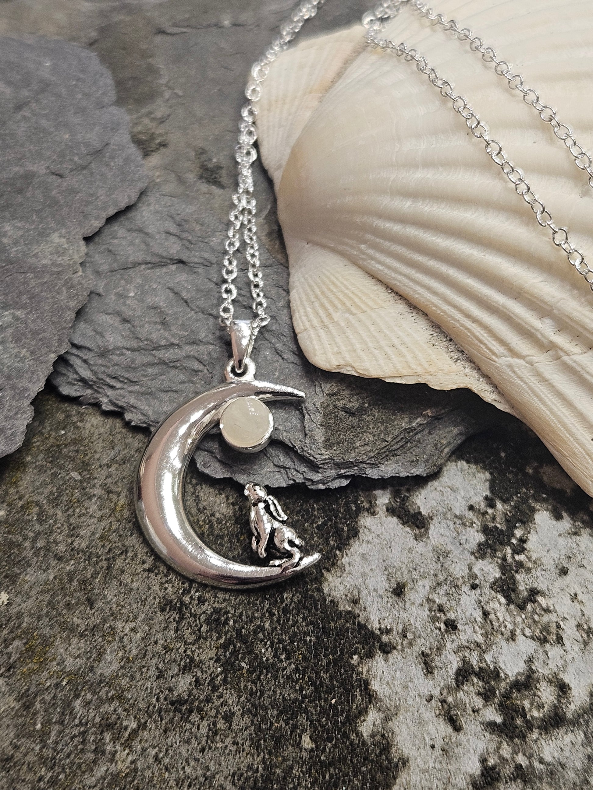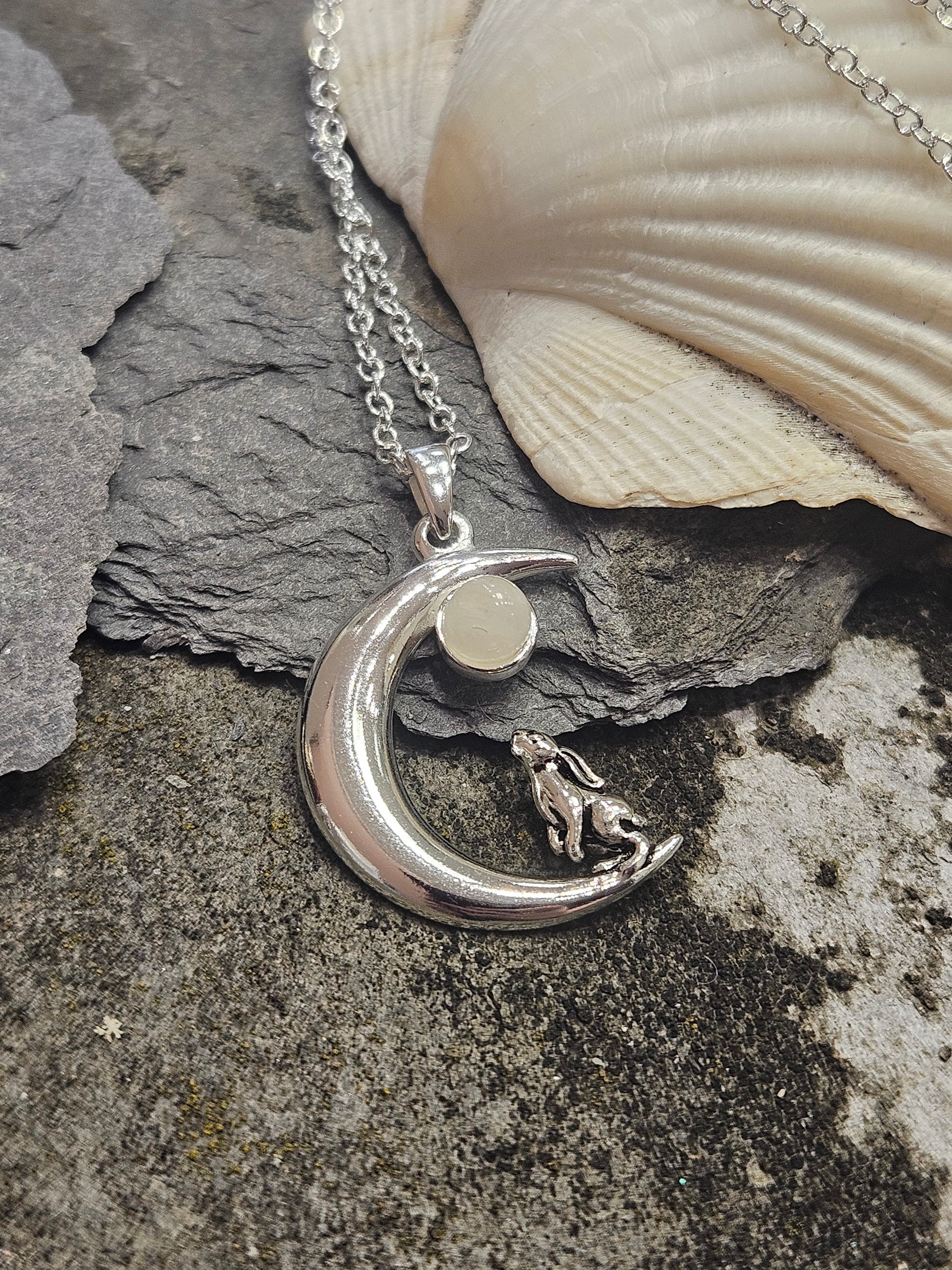 Stunning Rainbow Moonstone set in Stirling Silver with a moon gazing hare