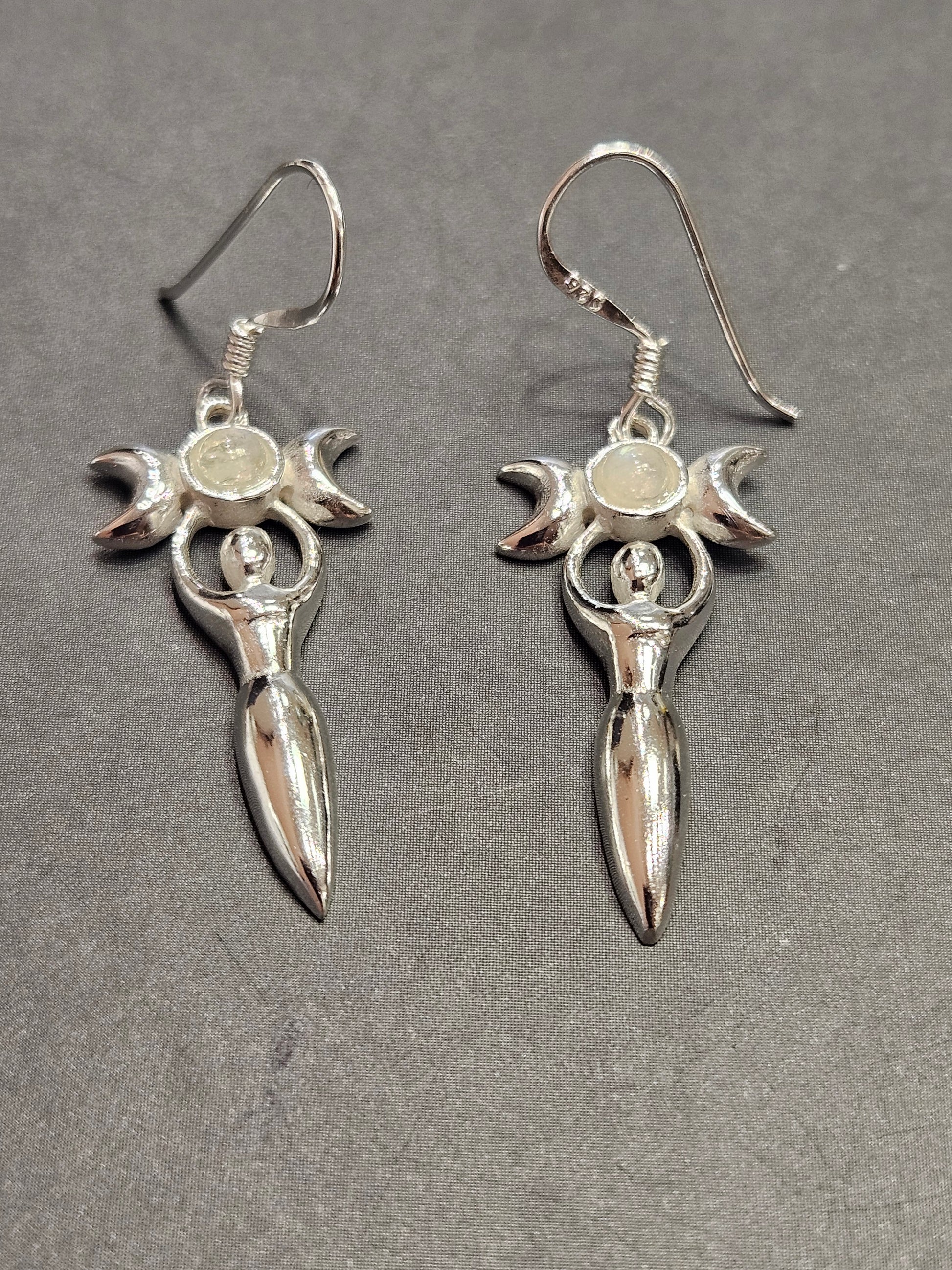 These Stunning Triple Moon Goddess Earrings are 925 Silver Goddess Earrings. She has her arms up holding a Triple Moon & the full moon in the centre has a Rainbow Moonstone set in it.