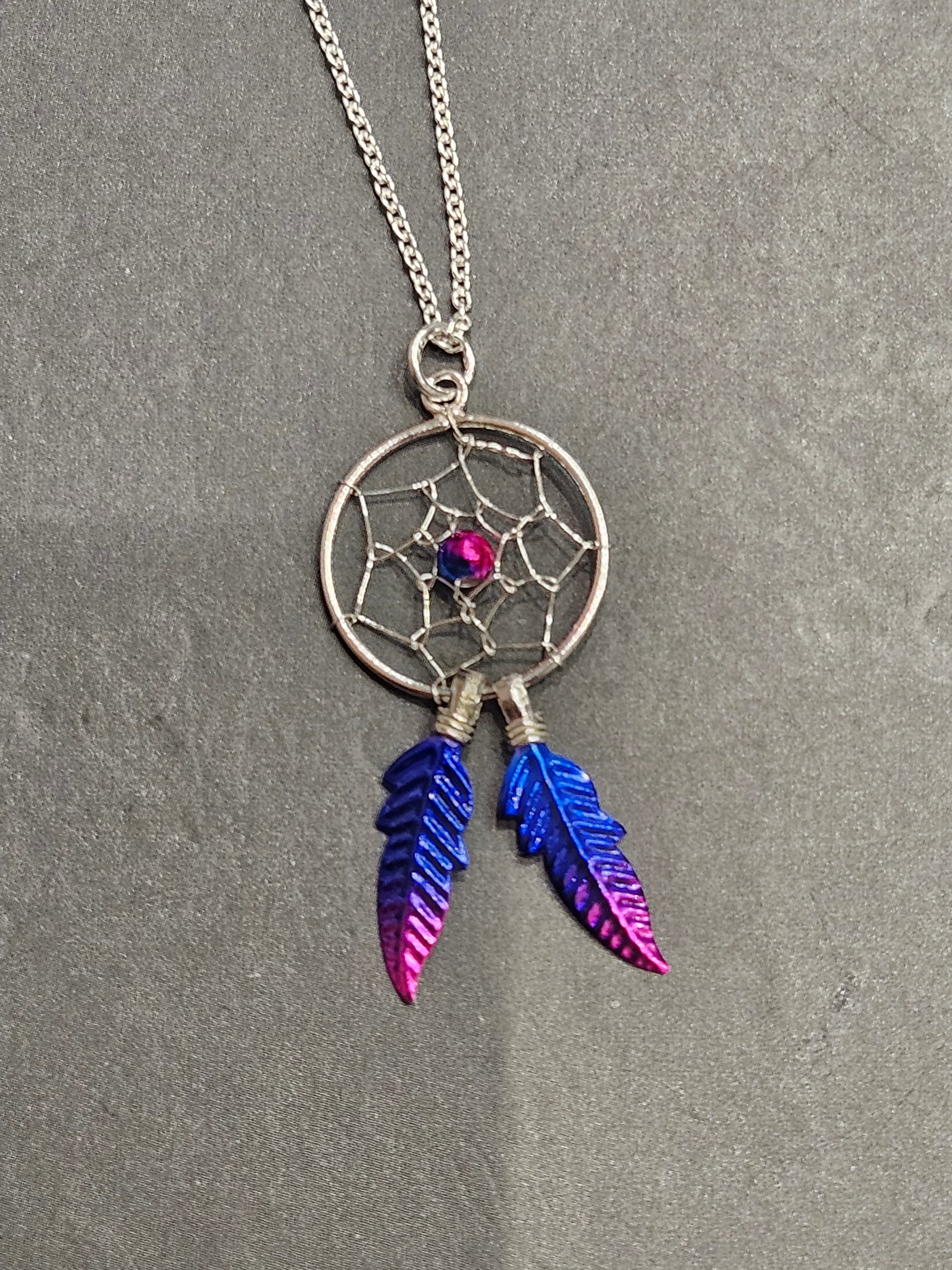 The Dreamcatcher has a Pretty Purple & Magenta Bead & 2 Silver Feathers. The feathers have a metallic Purple fading to Magenta finish on one side.